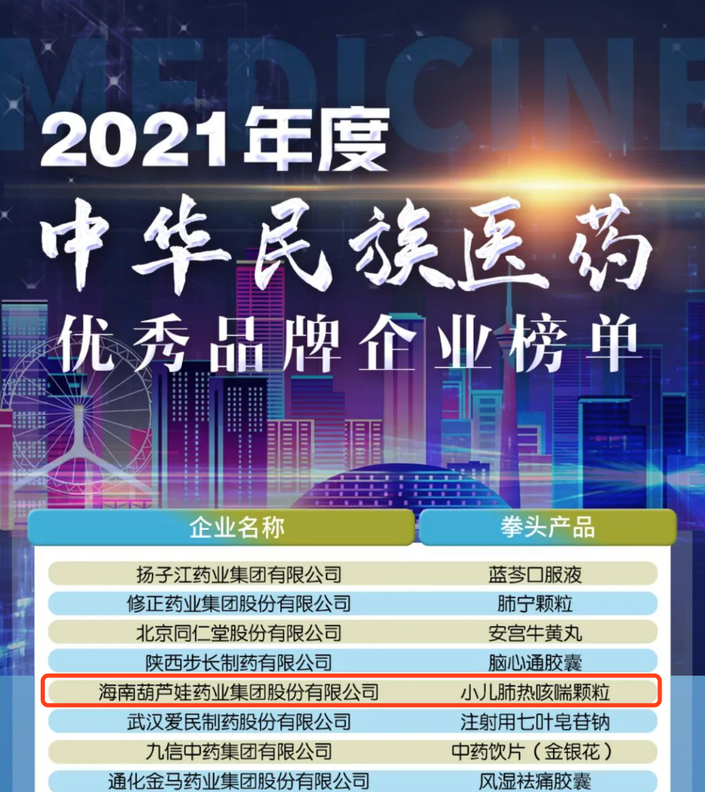 12月29日,全国工商联医药业商会发布了“2021年度中华民族医药优秀品牌企业榜单”,开云电竞药业集团凭借黄金单品小儿肺热咳喘颗粒(4克)实力登榜。
